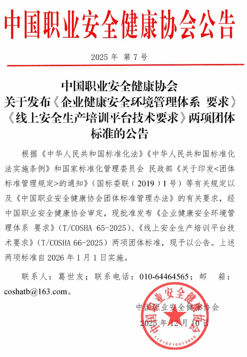 中国职业安全健康协会关于发布两项团体标准的公告